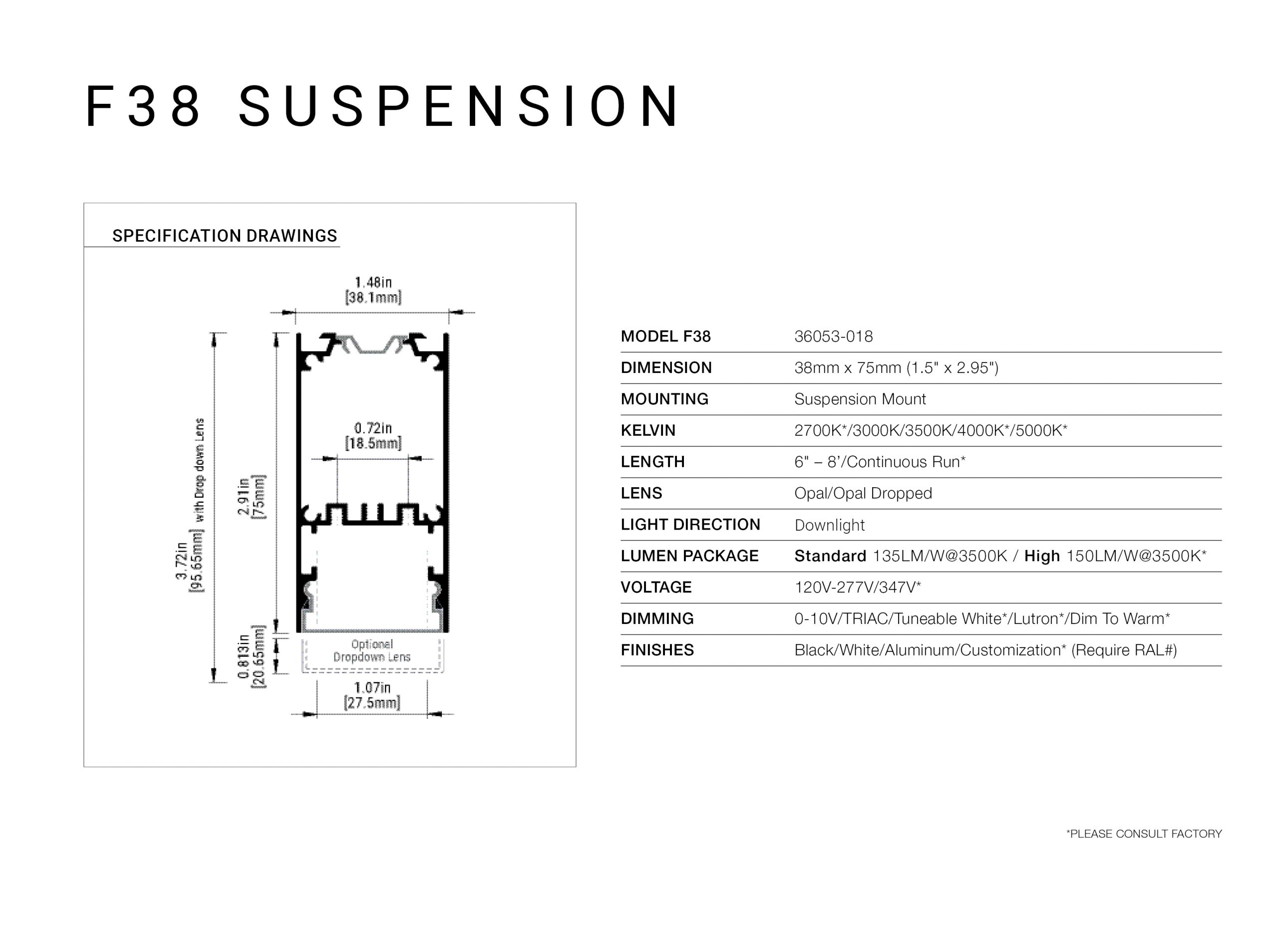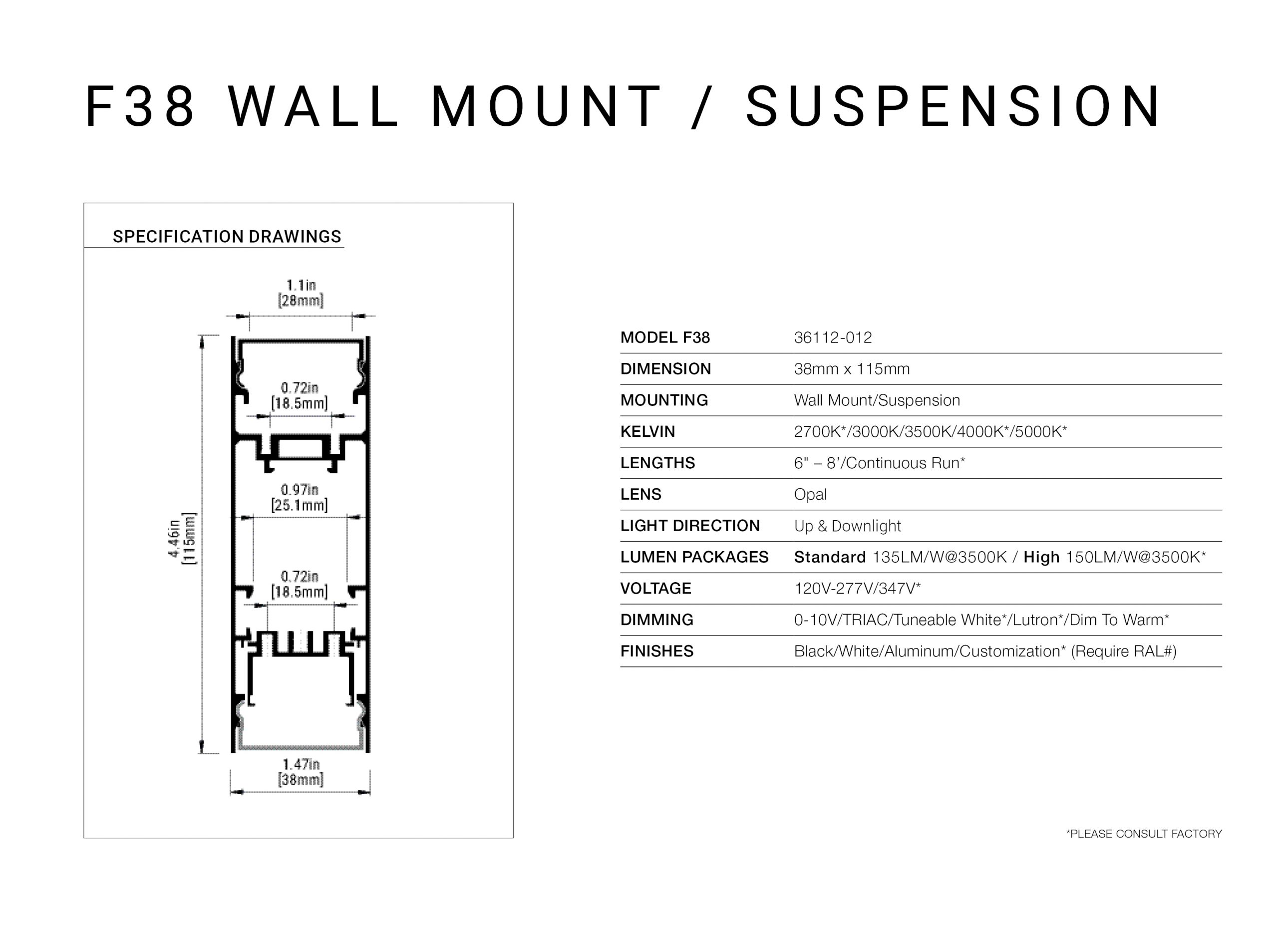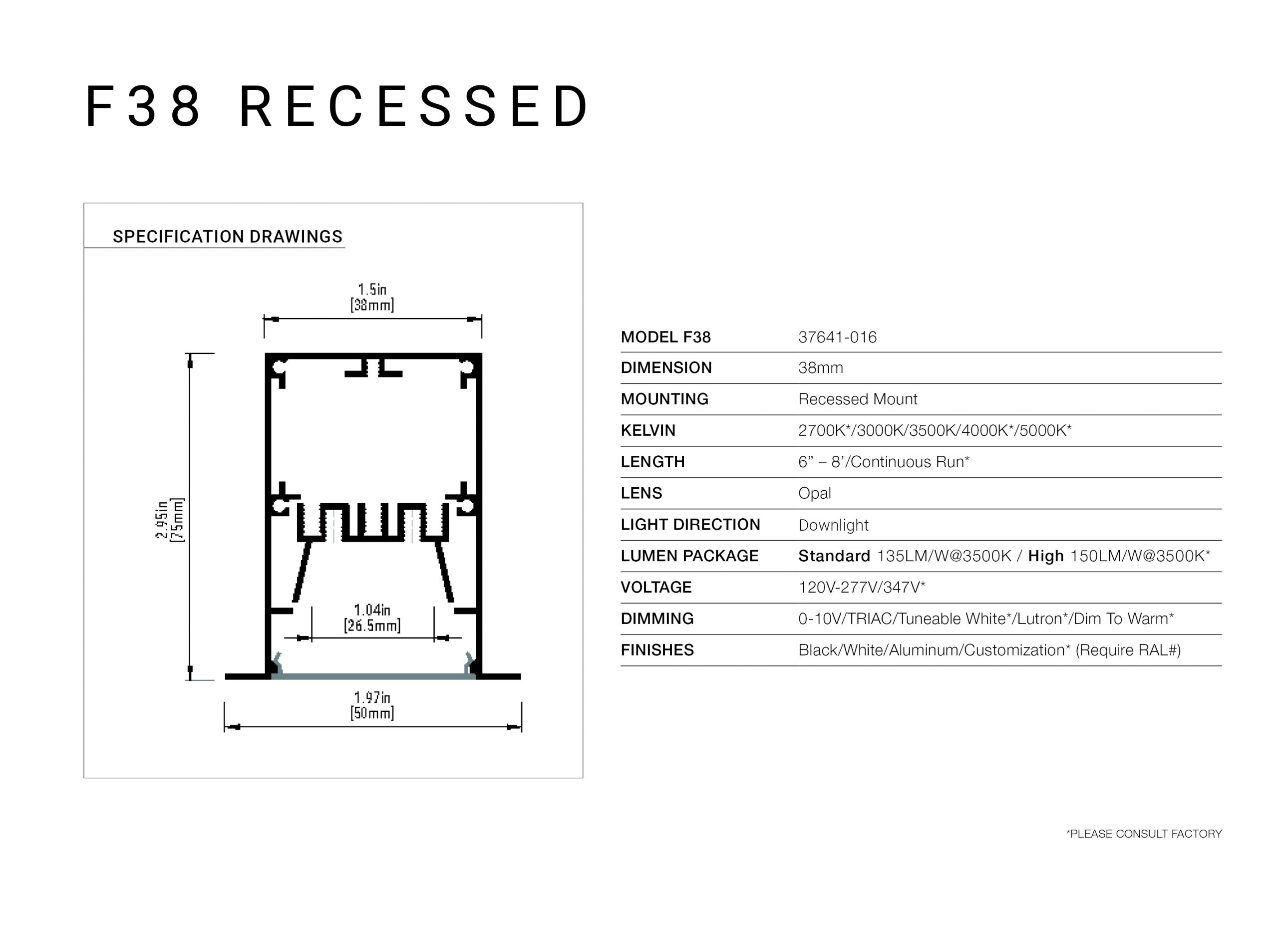 The F38 series is our Architectural Profile sporting an aluminum body with a width at 38mm. Ideal for small commercial and residential spaces.